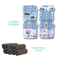 Kit com 4 Fraldas Ecológicas + 8 Absorventes de Fibra de Carvão – Ajustáveis e Reutilizáveis